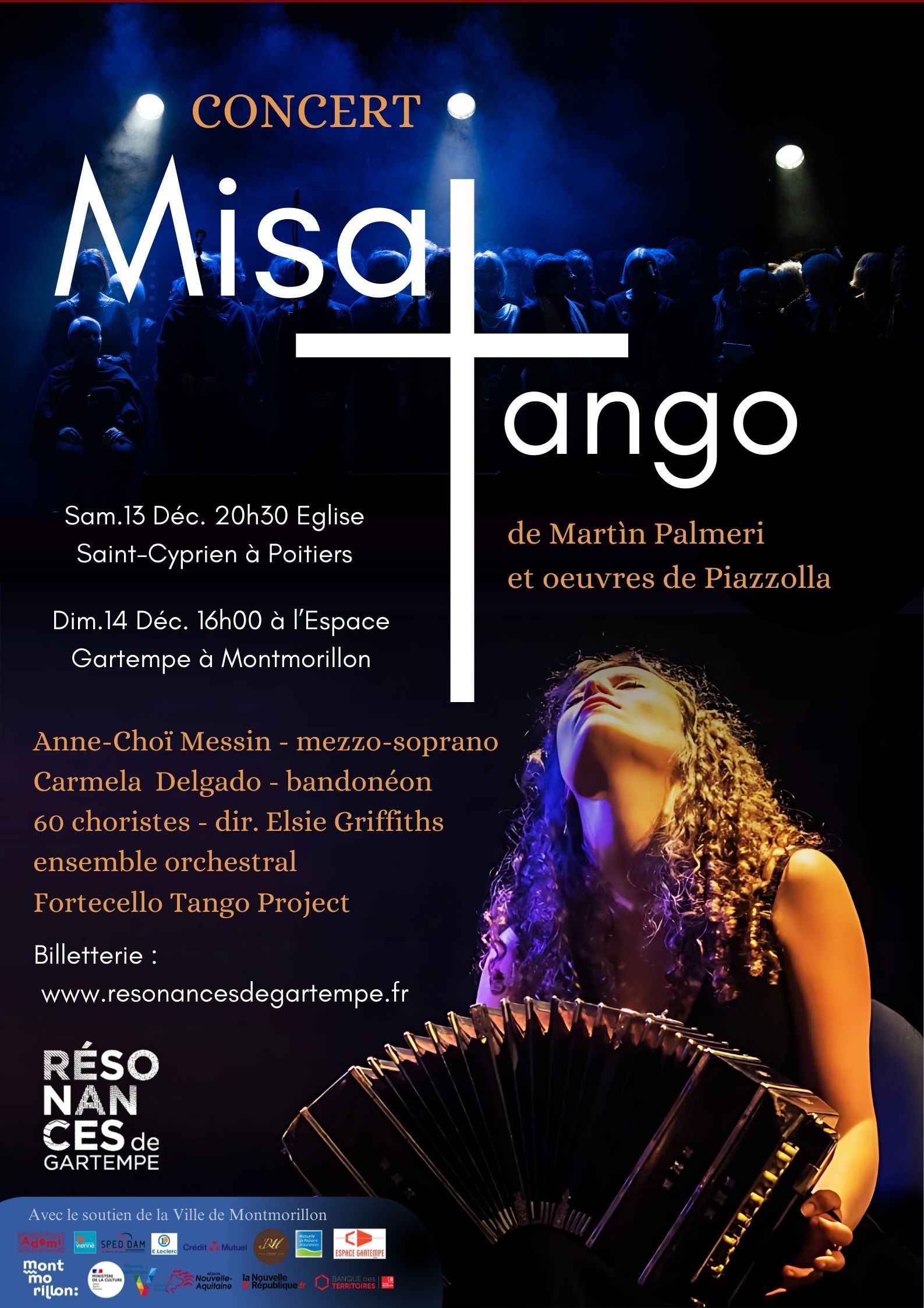 Créée il y a 20 ans par le compositeur argentin Martín Palmeri, MisaTango est une messe chorale sur des sonorités de Tango. Elle est composée sur les mêmes mouvements qu’une messe en latin classique, à laquelle se mêlent les harmoniques et les rythmes syncopés du tango. Le compositeur introduit en outre l’instrument emblématique du tango, le bandonéon, soliste aux côtés d’un orchestre à cordes (violons, violoncelles et contrebasse) et du piano. Une partie de mezzo-soprano solo vient ponctuer l’œuvre, répondant au chœur mixte.C'est, pour une messe latine, une œuvre étrange et magnifique, extraordinaire, d'une extrême tension dramatique, un climax d'opéra de quarante minutes, aux contrastes tranchés, entre les masses vocales et la seule soliste